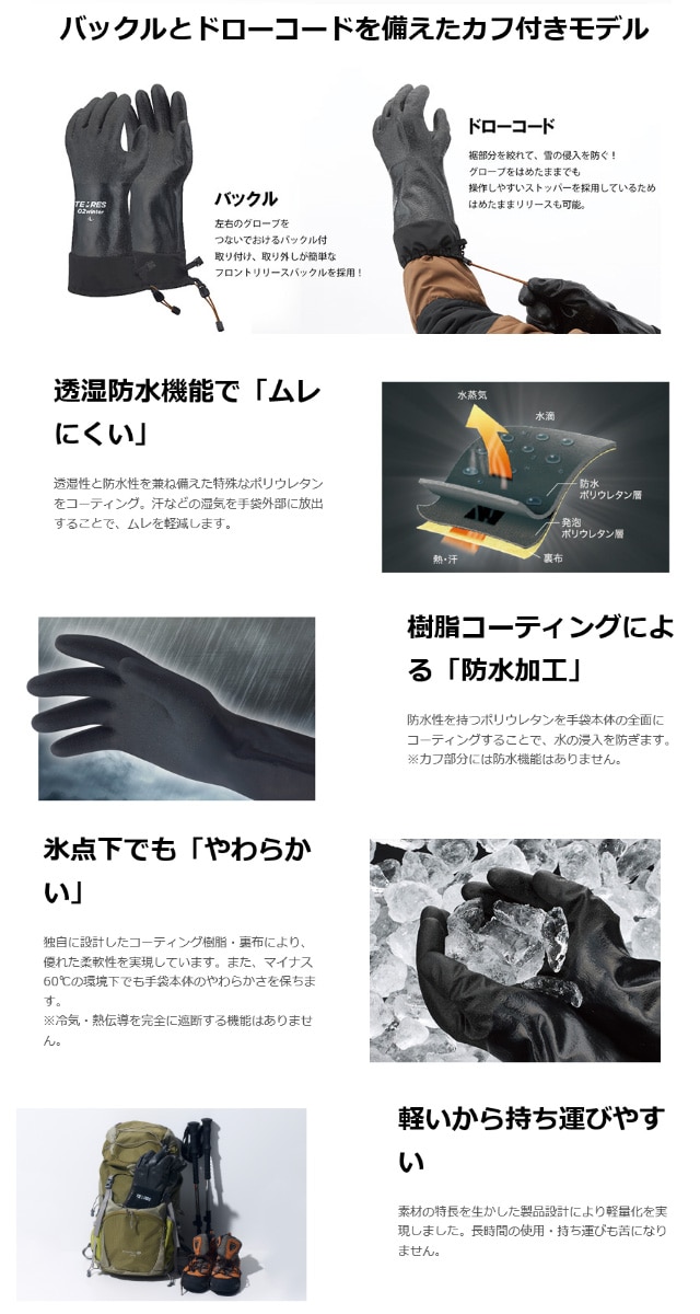 ● 透湿性と防水性を兼ね備えたポリウレタンをコーティングし、汗などの湿気を手袋外部に放出することでムレを軽減します。