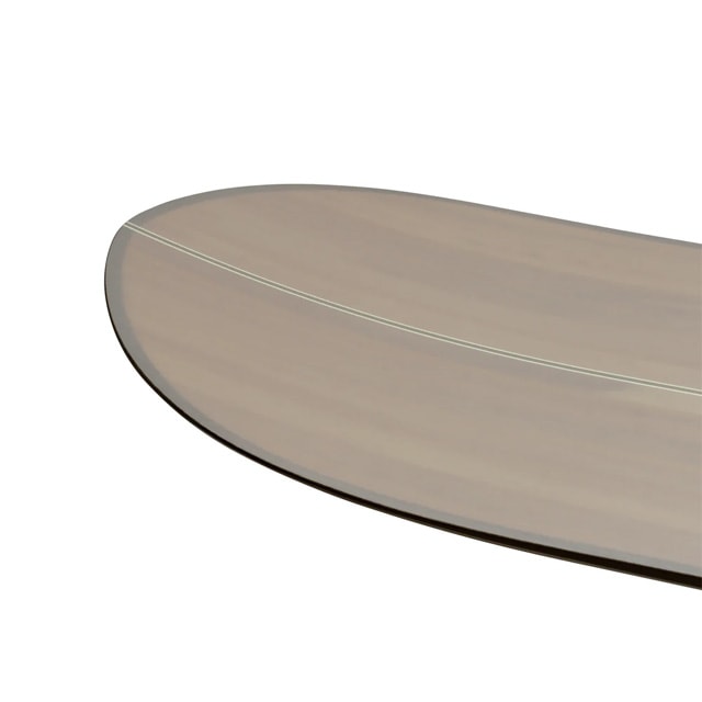 ノーズ最大幅から前足の辺りまで反りが全くなくフラットで前足辺りからテール最大幅3cmセンター寄りまで、アーチベンドの反りが入っている。(アーチ状のピークは後ろ足辺りとなる。)