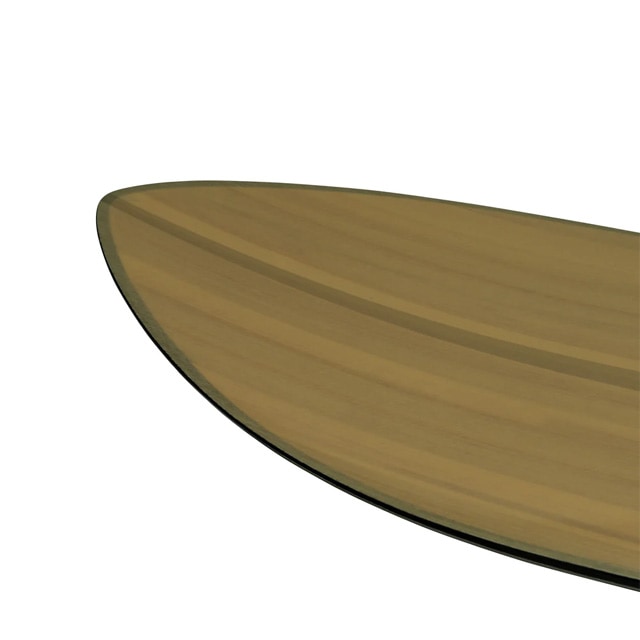 ノーズ最大幅から前足の辺りまで反りが全くなくフラットで前足辺りからテール最大幅3cmセンター寄りまで、アーチベンドの反りが入っている。(アーチ状のピークは後ろ足辺りとなる。)