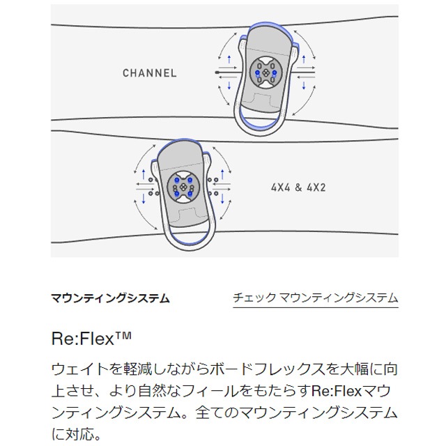 Re:Flex スノーボードバインディング. ゆったりとしたフレックスと一日中快適な装着感を提供する、ユニバーサル対応モデル。