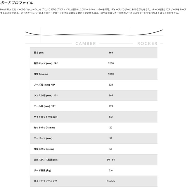 Pencil Plus にはノーズのロッカーシェイプによりS字のプロファイルが描かれたフロートキャンバーを採用。